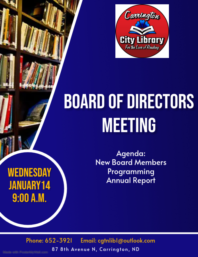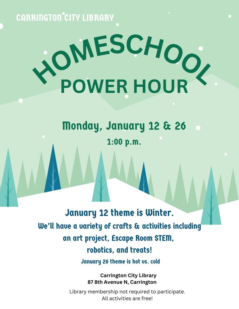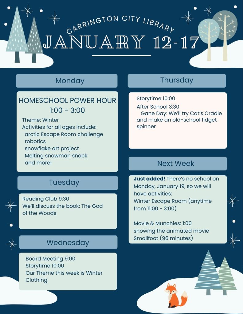 May 18, 2025January 11, 2026 ~ CarringtonCityLibrary Share this: Share on X (Opens in new window) X Share on Facebook (Opens in new window) Facebook Like Loading... Related Published by CarringtonCityLibrary Located just half a block off of Main Street, the Carrington City Library strives to promote a life-long love of reading for enjoyment and learning for all of our patrons. View all posts by CarringtonCityLibrary